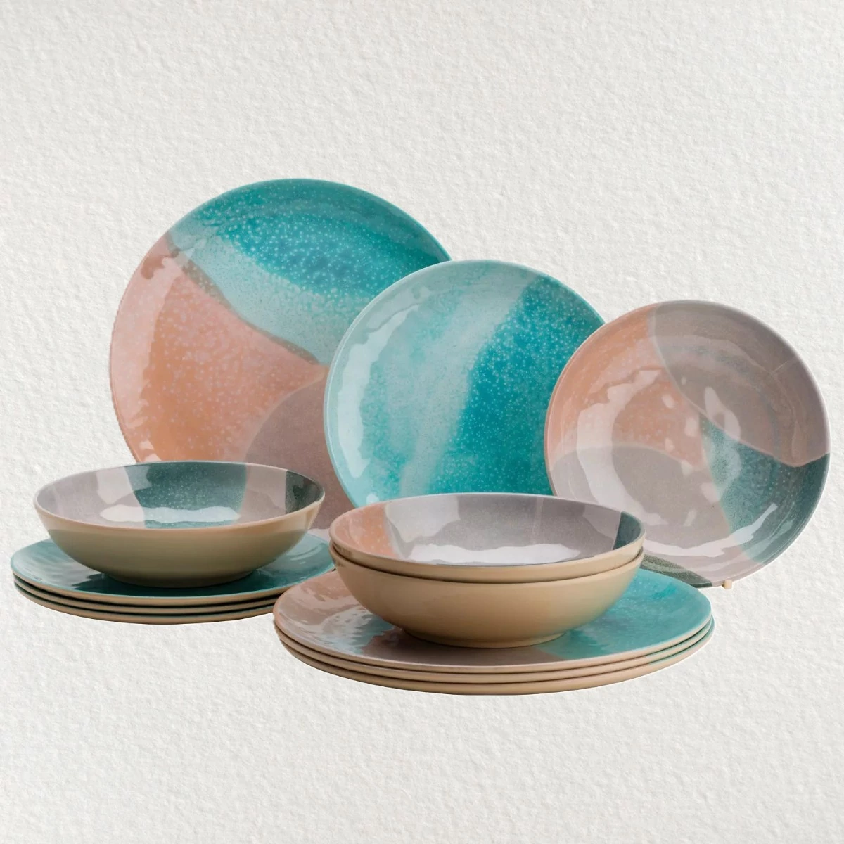 Skandináv-minimalista stílusú melamin étkészlet 4 fő részére. A készletben kis- és lapostányér, leveses tányér és bögre is található. Karcálló, matt kerámia hatású, helytakarékosan tárolható.