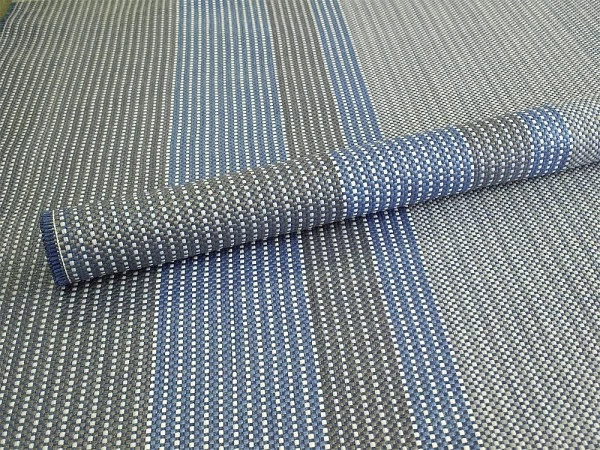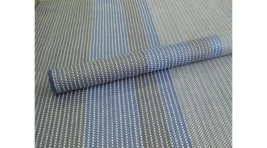 Sűrű szövésű, kék-fehér-szürke színű kültéri szőnyeg, 6 db szőnyeglefogató kampóval és tárolótáskával.