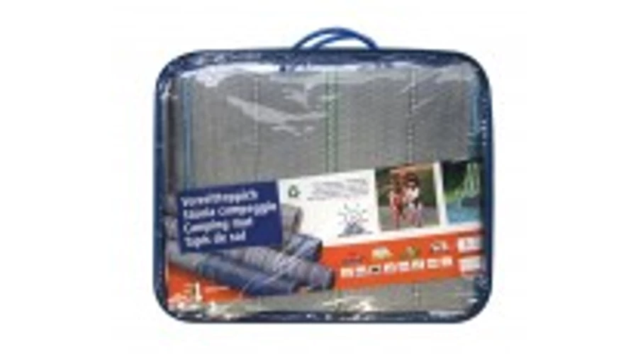 Sűrű szövésű, kék-fehér-szürke színű kültéri szőnyeg, 6 db szőnyeglefogató kampóval és tárolótáskával.