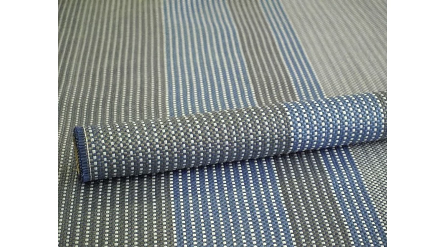 Sűrű szövésű, kék-fehér-szürke színű kültéri szőnyeg, 6 db szőnyeglefogató kampóval és tárolótáskával.