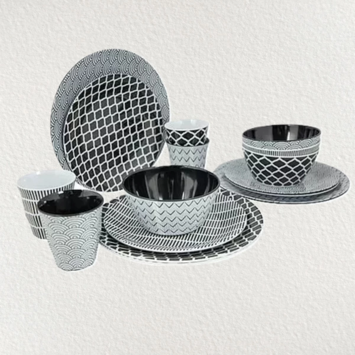 Skandináv-minimalista stílusú melamin étkészlet 4 fő részére. A készletben kis- és lapostányér, leveses tányér és bögre is található. Karcálló, matt kerámia hatású, helytakarékosan tárolható.