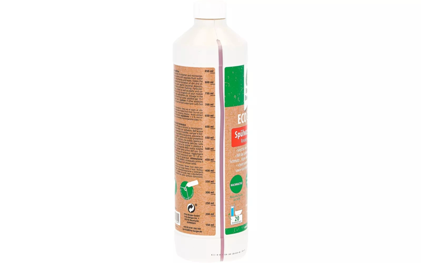 Természetes összetevőkből készült illatosítószer hordozható toalettekbe. Öblítéskor illatanyagot szabadít fel, óvja a tömítéseket és meggátolja az algásodást/szennyeződések kialakulását. Egy palack akár 20 feltöltésre is elegendő (15 literes frissvíz-tartály esetén).