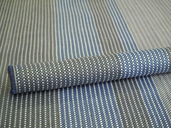 Sűrű szövésű, kék-fehér-szürke színű kültéri szőnyeg, 6 db szőnyeglefogató kampóval és tárolótáskával.