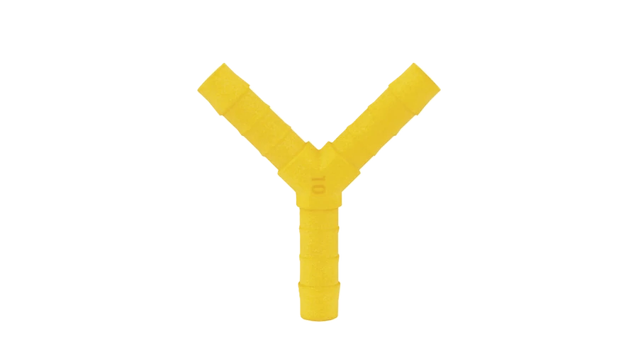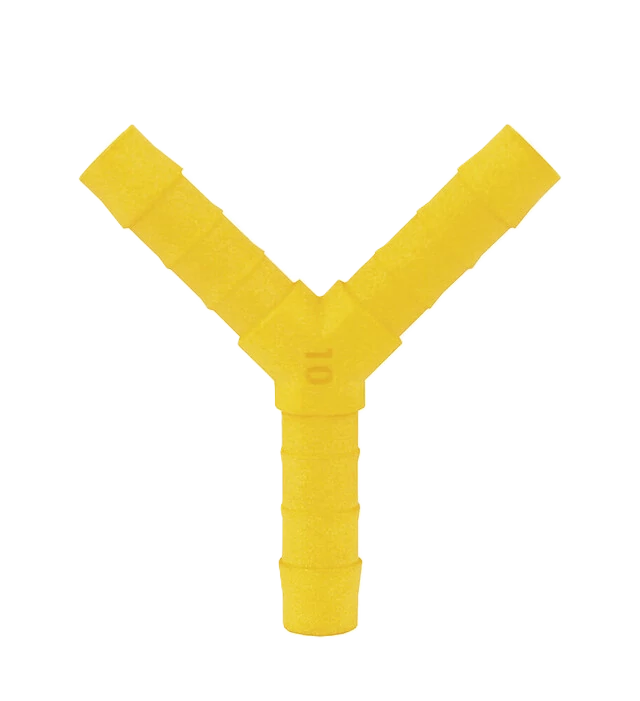 Vízcső összekötő elem, Y-idom, 10 mm belső átmérővel, sárga színben.